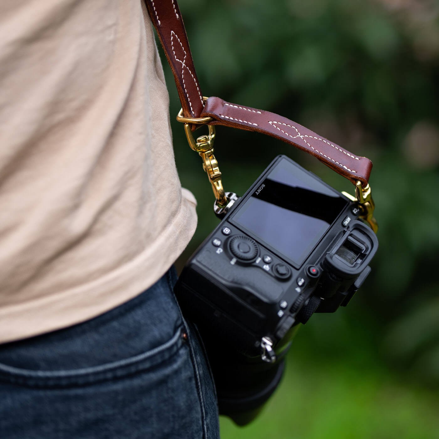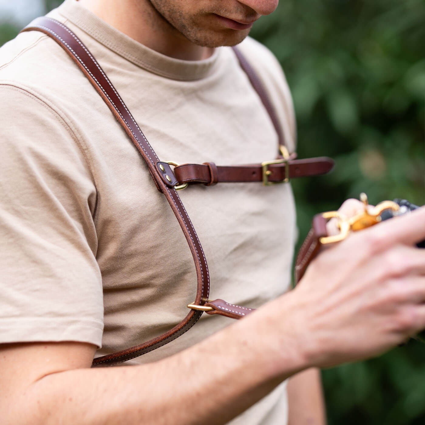 This leather harness for photographers is available in a single layer or padded shoulder version with leather-covered cushioning, both made from vegetable-tanned leather. The unlined leather is crafted to be extremely soft, ensuring comfort even for the most sensitive skin. The padded version provides greater structure and support while adding extra softness.